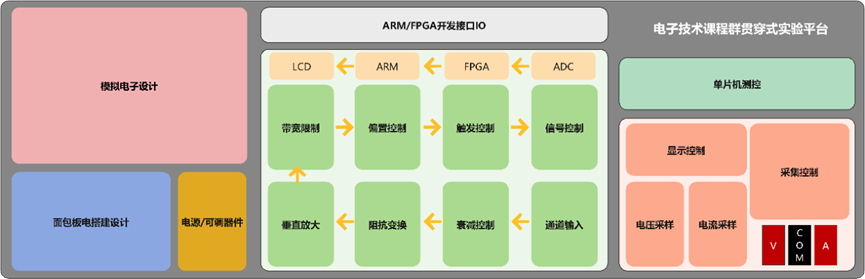 本平台以便携式仪器 + 自主开发模块为核心,面向电子信息专业学生,支撑电子系统综合、单片机测控、FPGA 信号采集与处理、嵌入式人机交互等课程的综合实验及课程群知识点贯通式工程设计。