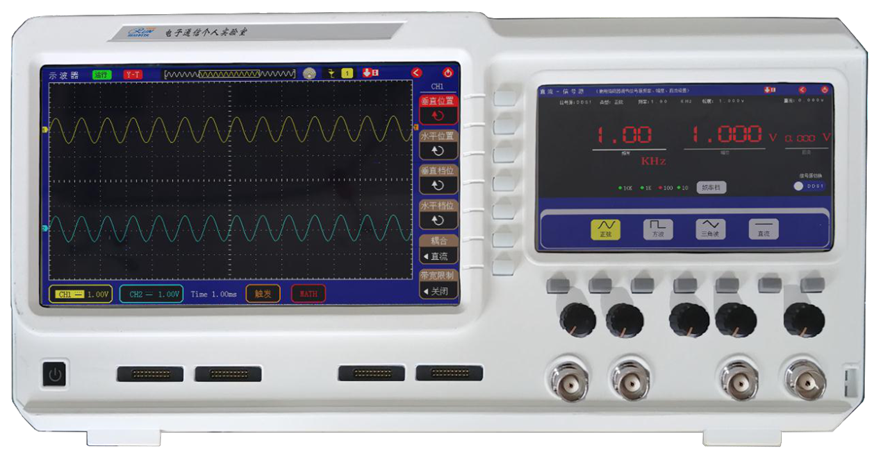 平台内嵌10.1寸和7寸两个TFT触摸液晶,10.1寸液晶用于示波器双踪信号显示,7寸液晶用于信号源及其他测试仪器数据显示;平台右侧面配置了三个USB口和一个网口,USB口分别用于单片机、FPGA、嵌入式开发,网口用于各种仪器采集数据和后台PC机通信,供学生进行Labview的虚拟仪器开发;
