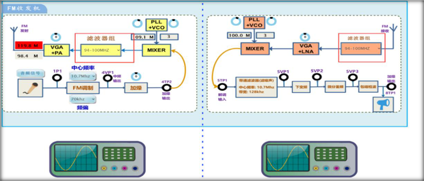 3、平台内线上板卡内单元电路级联能构成:无线模拟通信系统、无线数字音视频通信系统;